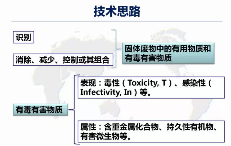 固廢管理的技術(shù)思路分為兩類,一方面應識別固廢中的有用物質(zhì)對其進行資源化利用;而另一方面對表現(xiàn)出毒性、感染性等含重金屬化合物、持久性有機物和有害微生物等有毒有害物質(zhì)需著力消除、減少、控制或使用組合措施。廢物處理中通常需要加入能量與化學物質(zhì),在轉(zhuǎn)化得到產(chǎn)品的同時可能產(chǎn)生大氣排放、水體排放與工藝殘余物,需要關(guān)注與控制。