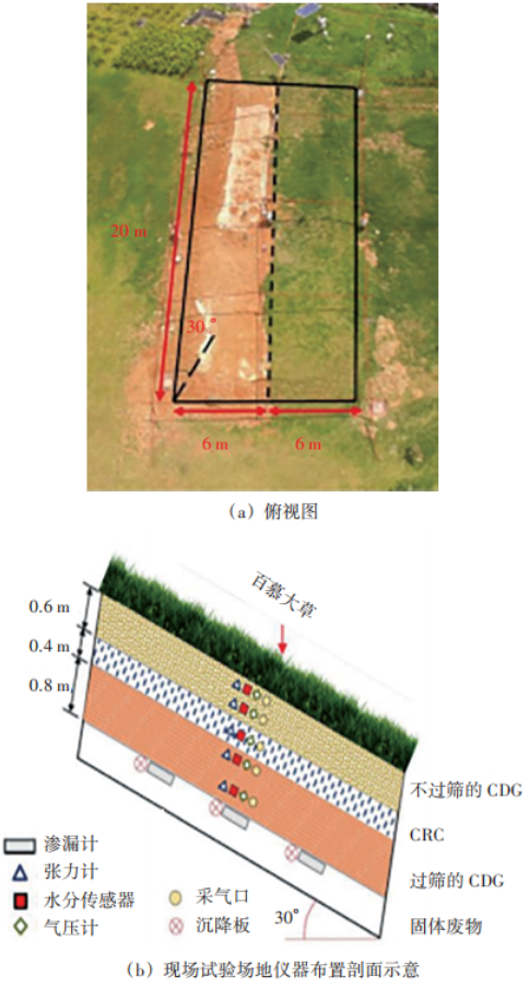 圖9 深圳下坪垃圾填埋場現(xiàn)場試驗場俯視圖及現(xiàn)場試驗場地儀器布置剖面示意