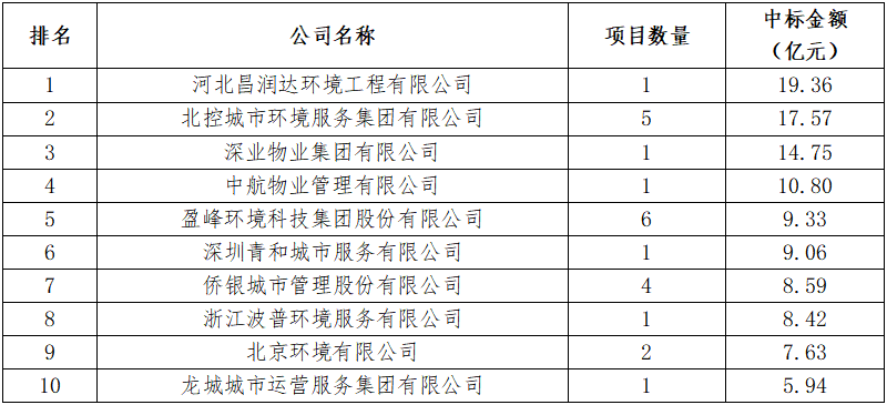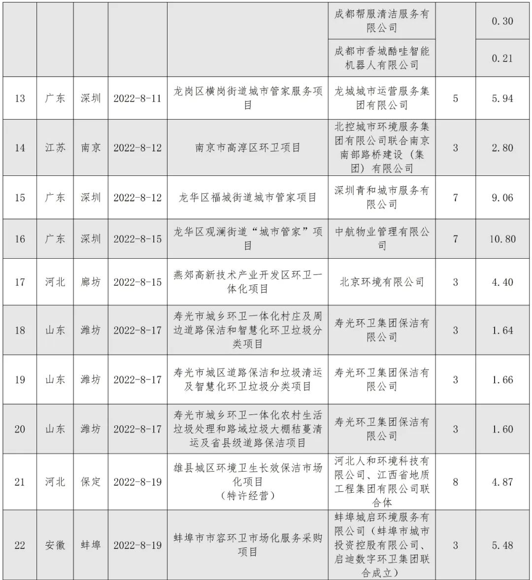 8月,河北昌潤(rùn)達(dá)環(huán)境工程有限公司憑借19.36億元的定州市城區(qū)環(huán)境衛(wèi)生市場(chǎng)化服務(wù)項(xiàng)目登頂企業(yè)月度排行榜榜首。定州市城區(qū)環(huán)境衛(wèi)生市場(chǎng)化服務(wù)項(xiàng)目特許經(jīng)營(yíng)期12年。服務(wù)范圍為河北省定州市市區(qū)西城、北城、南城、長(zhǎng)安辦、經(jīng)濟(jì)開發(fā)區(qū)及高速高鐵站主次干道、小街巷、商業(yè)街區(qū)、便民市場(chǎng)和市區(qū)水域,清掃保潔總面積9617672.66平方米,項(xiàng)目負(fù)責(zé)公共區(qū)域生活垃圾(不含物業(yè)小區(qū)其他垃圾)產(chǎn)生量每天200~260噸。昌潤(rùn)達(dá)以1.61億元/年的投標(biāo)報(bào)價(jià)位中標(biāo)該項(xiàng)目。昌潤(rùn)達(dá)成立于2014年8月,位于保定市國(guó)家大學(xué)科技園8號(hào)樓,是河北省首批成立的一家集垃圾分類、城鄉(xiāng)環(huán)衛(wèi)一體化、公用設(shè)施管理維護(hù)、農(nóng)村廁改與吸污處理、智慧環(huán)衛(wèi)等多位一體的科技型環(huán)衛(wèi)一體化大型集團(tuán),系中國(guó)清潔服務(wù)行業(yè)百?gòu)?qiáng)企業(yè)。昌潤(rùn)達(dá)是一家典型的立足本土的環(huán)衛(wèi)企業(yè),其服務(wù)區(qū)域主要集中在保定市及周邊縣、區(qū)和邯鄲市部分縣鄉(xiāng)村。2021年8月,知名物企佳兆業(yè)美好曾宣布擬以3.67億元的價(jià)格收購(gòu)昌潤(rùn)達(dá)70%的股權(quán),但最終因“公司經(jīng)營(yíng)策略調(diào)整”,交易在年底告吹。從今年中標(biāo)的項(xiàng)目來(lái)看,昌潤(rùn)達(dá)似乎還沒有準(zhǔn)備走出河北,依舊在深耕自己的“一畝三分地”。● 北控城市環(huán)境連下五城,全年項(xiàng)目金額超48億元8月,北控城市環(huán)境迎來(lái)一波拿標(biāo)高潮,連續(xù)中標(biāo)5個(gè)環(huán)衛(wèi)項(xiàng)目,合計(jì)中標(biāo)金額達(dá)17.57億元,一舉拿下榜眼位置。表2 北控城市環(huán)境8月中標(biāo)項(xiàng)目匯總