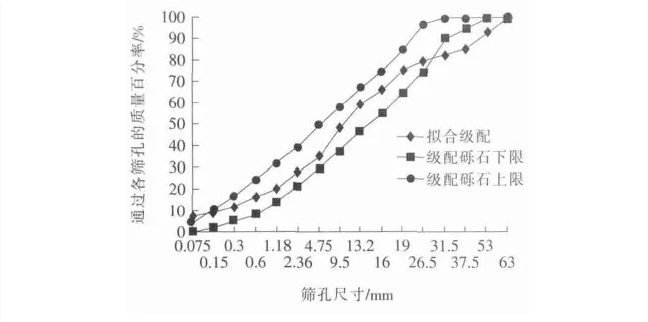 根據(jù)振動擊實后建筑垃圾的級配擬合曲線特點,對由相似級配延伸法得到的最大公稱粒徑為75mm、最小公稱粒徑為4.75mm的建筑垃圾級配進行優(yōu)化,即得建筑垃圾用于公路墊層的級配范圍。