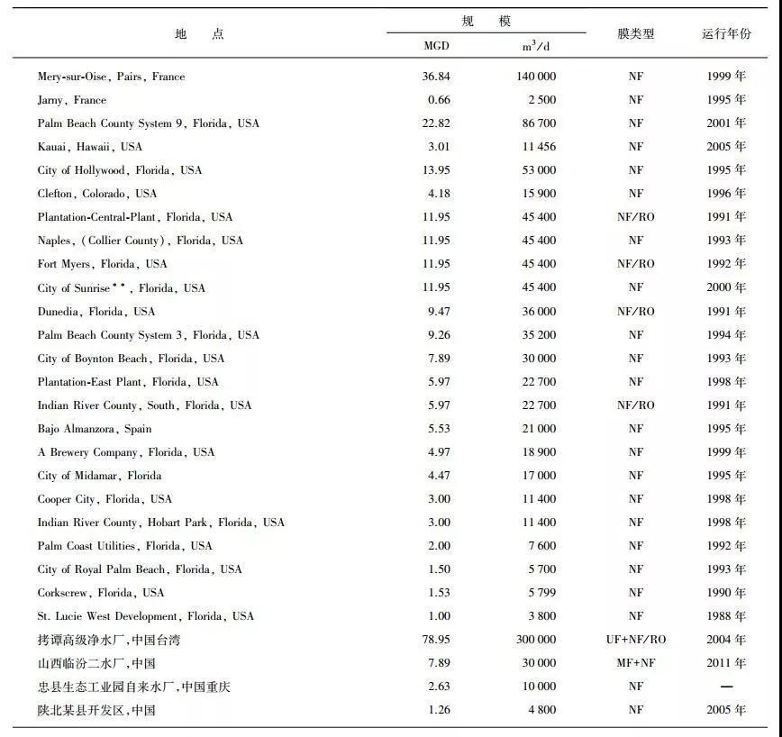 在沙特阿拉伯,沙特國(guó)家海水淡化公司(SWCC)公司成功地開發(fā)出了納濾作為海水淡化的預(yù)處理技術(shù),用于脫除硬度和總?cè)芙夤腆w,降低了反滲透的操作壓力并提高了系統(tǒng)的回收率。我國(guó)首套工業(yè)化大規(guī)模膜軟化系統(tǒng)144 m3/d納濾膜淡化苦咸水制備飲用水示范工程,由國(guó)家海洋局杭州水處理中心設(shè)計(jì),于1997年10月在山東長(zhǎng)島南隍城建成投產(chǎn)。