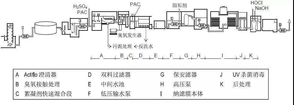 圖3 法國(guó)Mery-sur-Oise水廠NF飲用水深度處理工藝流程圖