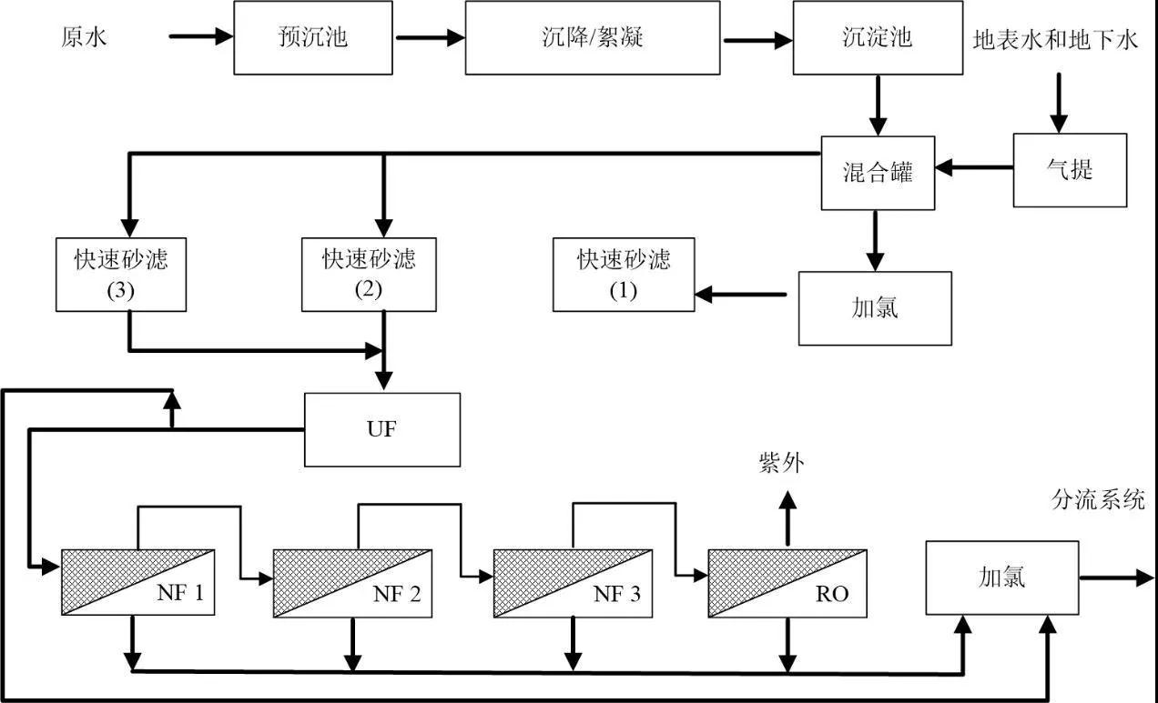 目前美國(guó)已有超過100萬m3/d規(guī)模的NF軟化水裝置在運(yùn)轉(zhuǎn),1992年~1996年美國(guó)的NF裝置以500%的速度增長(zhǎng)。以Florida州為例,由于飲用水源多為表層含水層地下水,普遍存在鹽度、硬度和金屬離子以及有機(jī)物含量大幅度超標(biāo)的問題。為了更好地滿足日益嚴(yán)格的飲用水水質(zhì)要求,目前已有多座城市水處理廠采用NF和RO工藝逐步代替現(xiàn)用的石灰軟化水處理工藝。處理量4.2 MGD(1.59萬m3/d)美國(guó)科羅拉多Clefton水廠于1996年投運(yùn),采用NF膜過濾系統(tǒng)對(duì)地表水進(jìn)行深度處理,出水顯示,NF膜對(duì)TDS、硬度、硫酸鹽、消毒副產(chǎn)物和總磷的脫除率分別為50%、80%、98%、95%以上和97%。美國(guó)Florida州下屬的Deerfiled Beach市和Boca Raton市分別于2003年和2004年建成投產(chǎn)4.0萬m3/d和15.2萬m3/d(當(dāng)時(shí)最大的NF脫鹽軟化裝置)的飲用水NF膜處理系統(tǒng),主要用于原水中硬度、色度和消毒副產(chǎn)物(三鹵甲烷、鹵乙酸等)生成潛勢(shì)的去除,滿足了當(dāng)?shù)仫嬘盟|(zhì)標(biāo)準(zhǔn)的要求。兩水廠的NF膜工藝運(yùn)行穩(wěn)定,運(yùn)行兩年內(nèi)未進(jìn)行化學(xué)清洗。與之相似,位于Fort Lauderdale市的Peele-Dixie水處理廠和Jupiter鎮(zhèn)水處理廠分別采用了供水量達(dá)4.5萬m3/d和5.5萬m3/d的NF膜工藝,NF出水水質(zhì)優(yōu)良。此外,我國(guó)臺(tái)灣高雄地區(qū)的拷譚高級(jí)凈水廠于2007年投運(yùn)一套30萬m3/d的NF凈水系統(tǒng)(其工藝流程圖如圖5所示),以去除水中的氨氮、消毒副產(chǎn)物等污染物質(zhì),是目前全球最大的NF凈水系統(tǒng)。目前為止,拷譚高級(jí)凈水廠的NF膜已運(yùn)行10年,NF膜對(duì)飲用水的深度處理效果顯著。