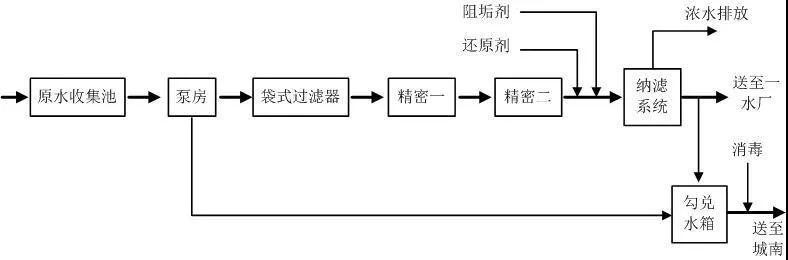 我國(guó)中西部地區(qū)水源具有的普遍問題是鹽度(硫酸鹽等)、硬度(鈣鎂含量高)、金屬離子和有機(jī)物含量超標(biāo),國(guó)內(nèi)一些市政水廠已開始使用納濾法處理高鹽原水。山西省呂梁市六壁頭水廠(運(yùn)行流程如圖6所示),針對(duì)硫酸鹽、硬度高、處理水量大的實(shí)際情況,通過方案比選,采用一級(jí)兩段式納濾膜處理工藝,處理部分原水再與原水混合的方案,該系統(tǒng)運(yùn)行情況良好,出水水質(zhì)較好。由流程圖6可以看出,原水取自原水收集池,經(jīng)原水泵升壓后,進(jìn)入三級(jí)過濾器去除大部分懸浮物和膠體,再送入NF系統(tǒng)處理。經(jīng)NF處理后的脫鹽水,部分與剩余原水按一定比例進(jìn)入勾兌水箱,消毒后加壓外輸至城南;部分脫鹽水通過原輸水管道重力自流至一水廠。