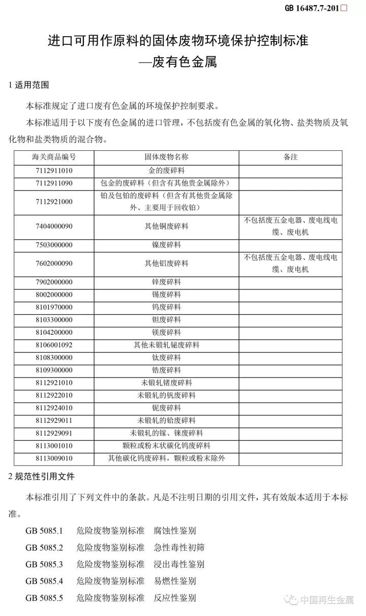 本標(biāo)準(zhǔn)是進(jìn)口固體廢物環(huán)境保護(hù)系列控制標(biāo)準(zhǔn)之一,適用于進(jìn)口可用作原料的固體廢物目錄中有關(guān)廢有色金屬的進(jìn)口管理。