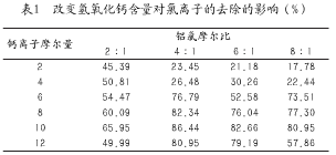 通過(guò)上述實(shí)驗(yàn)內(nèi)容的研究,對(duì)該方法中氯離子去除效果進(jìn)行深入分析,以供參考。采用控制變量法研究體系中氫氧化鈣摩爾含量對(duì)氯離子去除效果的影響,具體做法是將投入到反應(yīng)體系中的偏鋁酸鈉中和水體中氯的摩爾比控制為2∶1、4∶1、6∶1、8∶1,從而改變單一變量氫氧化鈣的加入量,探究其摩爾含量對(duì)氯離子去除效果的影響,探究結(jié)果如表1所示: