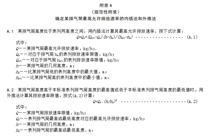 4.3.3.2若某排氣筒高度處于本標準列出的兩個值之間,其執(zhí)行最高允許排放速率以內(nèi)插法計算,內(nèi)插法的計算公式參見附錄A;當某排氣筒的高度大于或小于本標準列出的排氣筒高度最大值或最小值時,以外推法計算其最高允許排放速率,外推法計算公式參見附錄A。