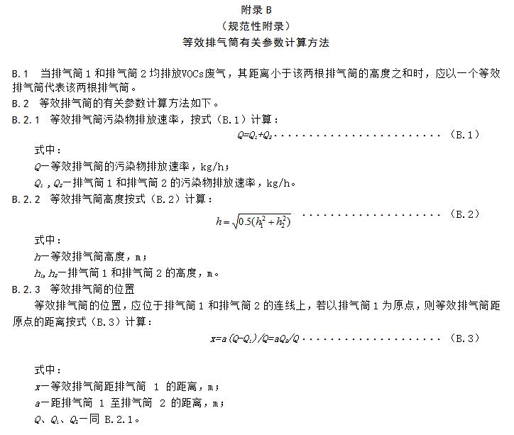 4.3.3.3兩個排放相同污染物的排氣筒,若其距離小于其幾何高度之和,應(yīng)合并視為一根等效排氣筒。若有三根以上的近距排氣筒,且排放同一種污染物,應(yīng)以前兩根的等效排氣筒,依次與第三、第四根排氣筒取等效值。等效排氣筒的有關(guān)參數(shù)計算方法參照附錄B。
