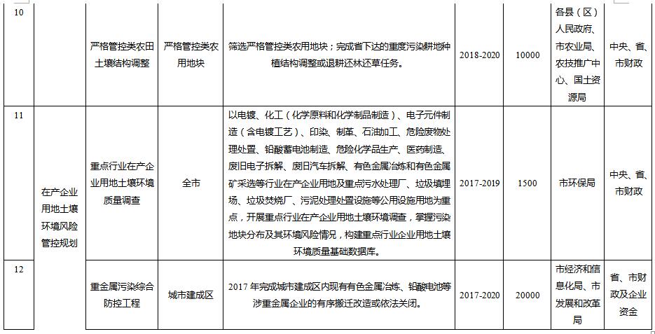農(nóng)用地土壤分區(qū)分類管控與治理修復(fù)重點(diǎn)項(xiàng)目共10項(xiàng),需專項(xiàng)資金總計(jì)41850萬元;在產(chǎn)企業(yè)用地土壤環(huán)境風(fēng)險(xiǎn)管控重點(diǎn)項(xiàng)目共5項(xiàng),預(yù)計(jì)專項(xiàng)資金總計(jì)47800萬元;關(guān)閉搬遷企業(yè)地塊土壤治理與修復(fù)項(xiàng)目共3項(xiàng),預(yù)計(jì)專項(xiàng)資金總計(jì)14200萬元;垃圾填埋場(chǎng)及周邊環(huán)境整治重點(diǎn)項(xiàng)目共5項(xiàng),預(yù)計(jì)專項(xiàng)資金總計(jì)14709萬元;土壤修復(fù)整治重點(diǎn)項(xiàng)目共15項(xiàng),預(yù)計(jì)專項(xiàng)資金總計(jì)54600萬元;工業(yè)園區(qū)風(fēng)險(xiǎn)防范共2項(xiàng),預(yù)計(jì)專項(xiàng)資金總計(jì)8300萬元;土壤污染防治能力提升重點(diǎn)項(xiàng)目共3項(xiàng),預(yù)計(jì)專項(xiàng)資金總計(jì)6700萬元。