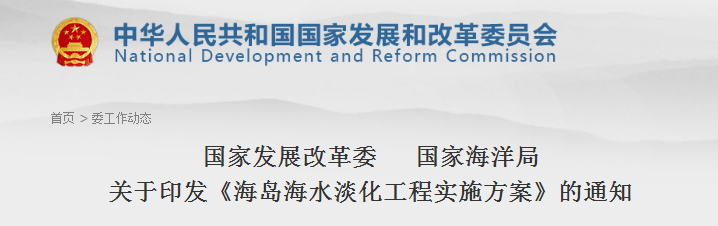 國家發(fā)展改革委 國家海洋局關(guān)于印發(fā)《海島海水淡化工程實(shí)施方案》的通知