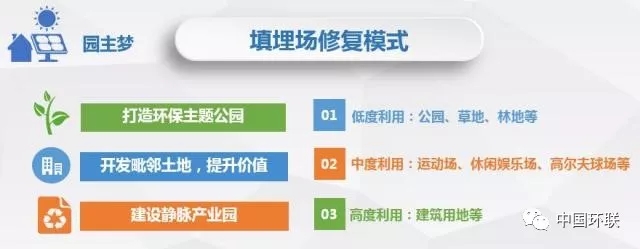 南京萬(wàn)德斯的“園主夢(mèng)”主要基于以下三種修復(fù)模式,第一,低度利用,打造環(huán)保主題公園,可將填埋場(chǎng)開(kāi)發(fā)成城市周圍的草地、林地、近郊旅游地或者公園;第二,中度利用,依托修復(fù)后的高標(biāo)準(zhǔn)公園綠地進(jìn)行毗鄰?fù)恋氐纳虡I(yè)開(kāi)發(fā)(如運(yùn)動(dòng)場(chǎng)、休閑娛樂(lè)場(chǎng)、高爾夫球場(chǎng)等);第三,高度利用,建設(shè)靜脈產(chǎn)業(yè)園,將其能源價(jià)值發(fā)揮出來(lái)。