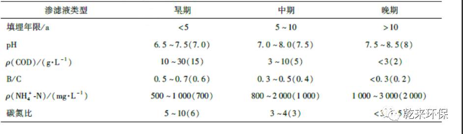 由表1 可知,早期垃圾滲濾液的水質(zhì)特點就是有機(jī)物含量很高,可生化性強(qiáng),但氨氮濃度相對較低;晚期垃圾滲濾液的水質(zhì)特點就是氨氮含量高,可生化性變差且碳氮比大幅度降低,中期滲濾液的水質(zhì)介于早期和晚期滲濾液之間. 同時,對于同一地區(qū)的雨季來說,滲濾液往往產(chǎn)量大,且有機(jī)物含量高,而旱季則產(chǎn)量小,具有較高的氨氮濃度. 滲濾液水質(zhì)的第3 個特點是營養(yǎng)比例失調(diào). 滲濾液中有機(jī)物和氨氮濃度非常高,但磷元素的含量卻很低,同時,重金屬的含量往往較高. 較低的磷含量和較高的重金屬含量增加了滲濾液生物處理的難度,這對滲濾液的有效處理是個挑戰(zhàn).