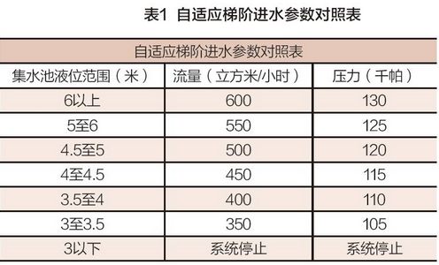 表1是本系統(tǒng)中梯階自適應(yīng)液位與流量壓力的參數(shù)對照表。這里的壓力與流量是對應(yīng)的,其壓力是根據(jù)膜的參數(shù)信息進(jìn)行對照查詢所得。液位與流量則是通過粗略計算和實驗矯正所得。當(dāng)集水池液位大于6米時,存在溢出風(fēng)險,這個時候系統(tǒng)滿負(fù)荷運行。當(dāng)?shù)陀?米時,為了防止提升泵干抽,我們將停止系統(tǒng)運轉(zhuǎn)。