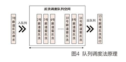 這里我們采用隊列法來處理廊道競爭問題。隊列法是一種遵循先進(jìn)先出原則的調(diào)度方法。具體原理如圖4所示。隊列調(diào)度由入隊列、出隊列和調(diào)度隊列空間三部分組成。入隊列是根據(jù)廊道反洗請求情況將有反洗需求的廊道壓入到隊列空間的過程。出隊列則是根據(jù)當(dāng)前的反洗設(shè)備的運行狀況將需要反洗的廊道彈出隊列的過程。反洗調(diào)度隊列空間即扮演一個存儲調(diào)度序列的角色,同時其還具有優(yōu)化和排布序列的功能。