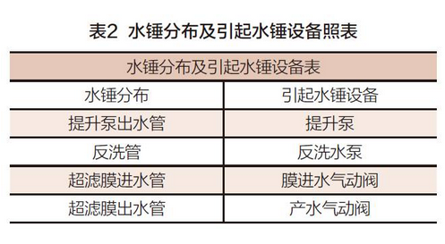 由于本超濾系統(tǒng)規(guī)模大,管道粗,水錘明顯。水錘位置主要存在于本系統(tǒng)的提升泵出水管、反洗管、超濾膜進(jìn)水管及超濾膜出水管中。對于這些管道及設(shè)備安裝位置可知,各位置引起水錘原因是有所不同,具體如表2所示: