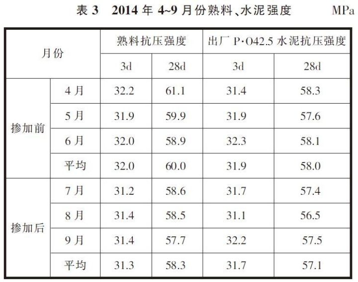 從表3可看出,使用污染土壤之后熟料3d、28d平均抗壓強度分別較使用前下降2.2%和2.8%;同樣出廠水泥強度也有所下降,9月份由于調(diào)整了水泥配比使水泥強度有所恢復(fù)。