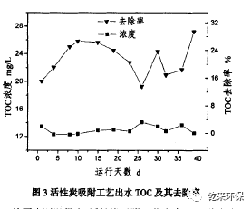 從圖中可以得出,活性炭吸附工藝出水TOC穩(wěn)定在12—14mg/L,去除效率保持在12%一32%之間,出水色度達(dá)到50倍以下,處理效果明顯。由于從AJO系統(tǒng)的出水到進(jìn)入活性炭吸附,經(jīng)過了二級(jí)絮凝沉淀,因此有效的降低了活性炭負(fù)荷,在此試驗(yàn)期間并沒有運(yùn)行反洗和蒸汽再生程序。并且由于試驗(yàn)操作規(guī)范,沒有發(fā)生物料流失的現(xiàn)象。