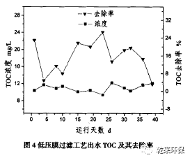 2.3低壓膜過濾工藝:活性碳纖維是碳纖維技術(shù)和活性炭技術(shù)相結(jié)合發(fā)展起來的新技術(shù),具有過濾和吸附的雙重作用,國(guó)內(nèi)外關(guān)于采用此工藝深度處理含有機(jī)物的廢水的報(bào)道逐漸增加。本文的低壓膜元件由高活性碳纖維制成,裝填在圓柱形過濾罐中,采用四級(jí)串聯(lián)運(yùn)行方式,每一級(jí)可以單獨(dú)的進(jìn)行反沖洗。主要工藝參數(shù)為,工作壓力為0.15—0.3MPa,孔隙率為85%,過水流量為3.5—4.5m3/(h˙m2)。低壓膜過濾工藝出水TOC及其去除率如圖4所示,