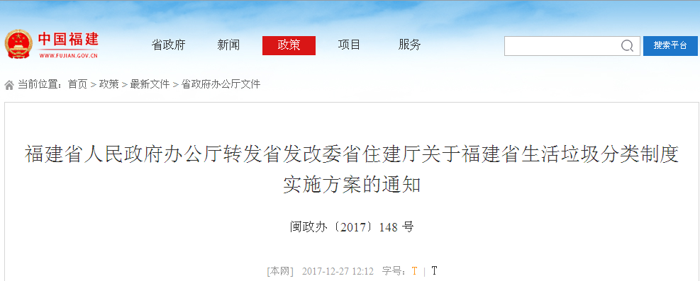 加快出臺(tái)垃圾分類實(shí)施辦法,福州市、廈門(mén)市2017年底前出臺(tái)生活垃圾分類辦法;其他設(shè)區(qū)市和平潭綜合實(shí)驗(yàn)區(qū)2018年底前出臺(tái)生活垃圾分類辦法或?qū)嵤┓桨浮?/p>