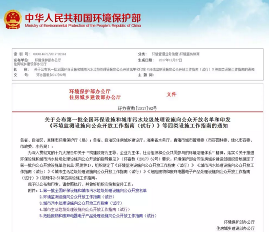 今年5月,環(huán)境保護(hù)部、住房城鄉(xiāng)建設(shè)部聯(lián)合印發(fā)《關(guān)于推進(jìn)環(huán)保設(shè)施和城市污水垃圾處理設(shè)施向公眾開放的指導(dǎo)意見》,要求2017年底前,各省級環(huán)境監(jiān)測機(jī)構(gòu)以及省會城市(區(qū))具備開放條件的環(huán)境監(jiān)測設(shè)施對公眾開放;各?。ㄗ灾螀^(qū)、直轄市)省會城市選擇一座具備條件的城市污水處理設(shè)施、一座垃圾處理設(shè)施作為定期向公眾開放點(diǎn);有條件的省份選擇一座危險(xiǎn)廢物或廢棄電器電子產(chǎn)品處理設(shè)施作為定期向公眾開放點(diǎn),各類開放點(diǎn)每兩個(gè)月應(yīng)至少組織開展一次公眾開放活動(dòng)。2020年底前,鼓勵(lì)各省在有條件的地級市選擇一座環(huán)境監(jiān)測設(shè)施、一座城市污水處理設(shè)施、一座垃圾處理設(shè)施作為開放點(diǎn);有條件的省份可新增危險(xiǎn)廢物或廢棄電器電子產(chǎn)品處理設(shè)施作為開放點(diǎn),推動(dòng)開放工作常態(tài)化。