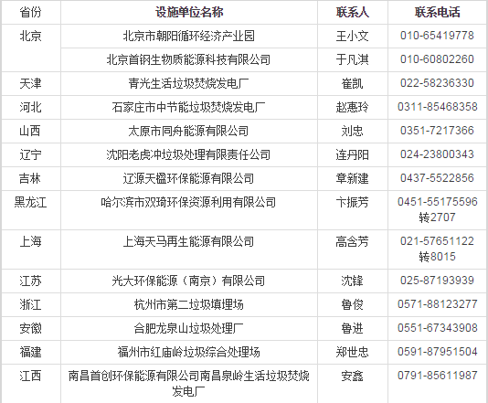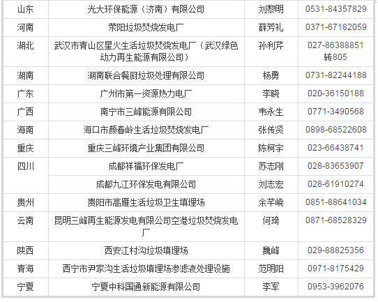 包括29個(gè)垃圾處理設(shè)施,其中垃圾焚燒設(shè)施21個(gè),垃圾填埋設(shè)施6個(gè),餐廚垃圾處理設(shè)施1個(gè),滲濾液處理設(shè)施1個(gè),分布于全國27個(gè)省、直轄市和自治區(qū),聯(lián)系人與聯(lián)系方式俱全。