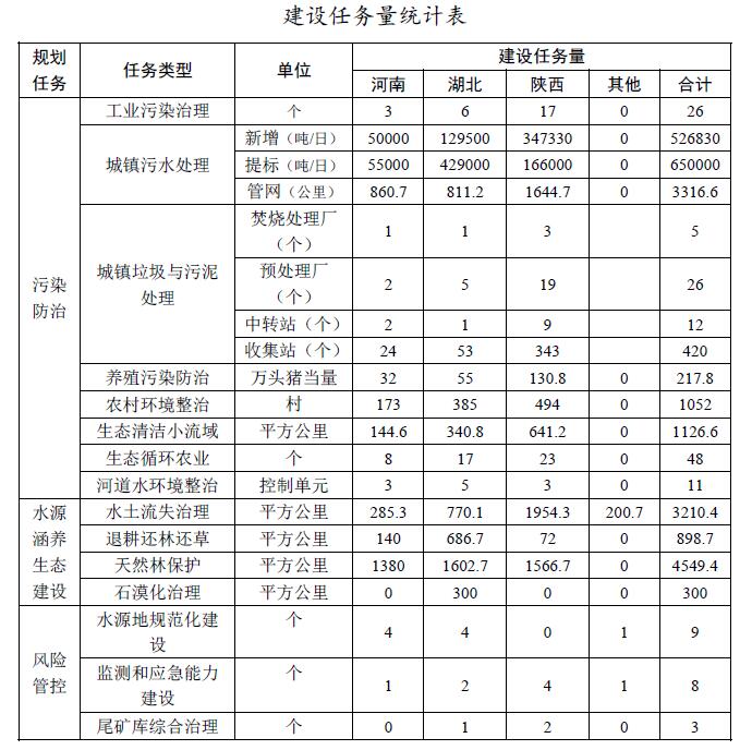 圍繞規(guī)劃目標(biāo),規(guī)劃實施污染防治、水源涵養(yǎng)與生態(tài)建設(shè)、風(fēng)險管控3大類建設(shè)任務(wù),估算總投資196億元。其中:工業(yè)污染防治項目26項,估算投資6.00億元;城鎮(zhèn)污水處理新增污水處理能力526830噸/日,新增管網(wǎng)3317公里,提標(biāo)改造能力650000噸/日,估算投資43.17億元;垃圾和污泥采取收集、預(yù)處理、轉(zhuǎn)運、焚燒進行綜合處理,新增垃圾和污泥處理處置能力8000噸/日,估算投資35.62億元;養(yǎng)殖污染防治新增217.8萬頭豬當(dāng)量治理能力,估算投資10.94億元;農(nóng)村環(huán)境綜合整治新增建制村1052個,估算投資15.76億元;生態(tài)清潔小流域治理面積1126.6平方公里,估算投資11.27億元;生態(tài)循環(huán)農(nóng)業(yè)與面源污染綜合治理試點48個,估算投資14.50億元;河道綜合整治(含人工濕地)11個控制單元,估算投資5.25億元;綜合治理水土流失面積3210平方公里,估算投資25.68億元;退耕還林還草和石漠化治理、天然林保護工程,估算投資16.4億元;水源地規(guī)范化建設(shè)項目9個,估算投資5.93億元;監(jiān)測和應(yīng)急能力建設(shè)項目8個,估算投資1.14億元;尾礦庫綜合治理3個,估算投資4.35億元。