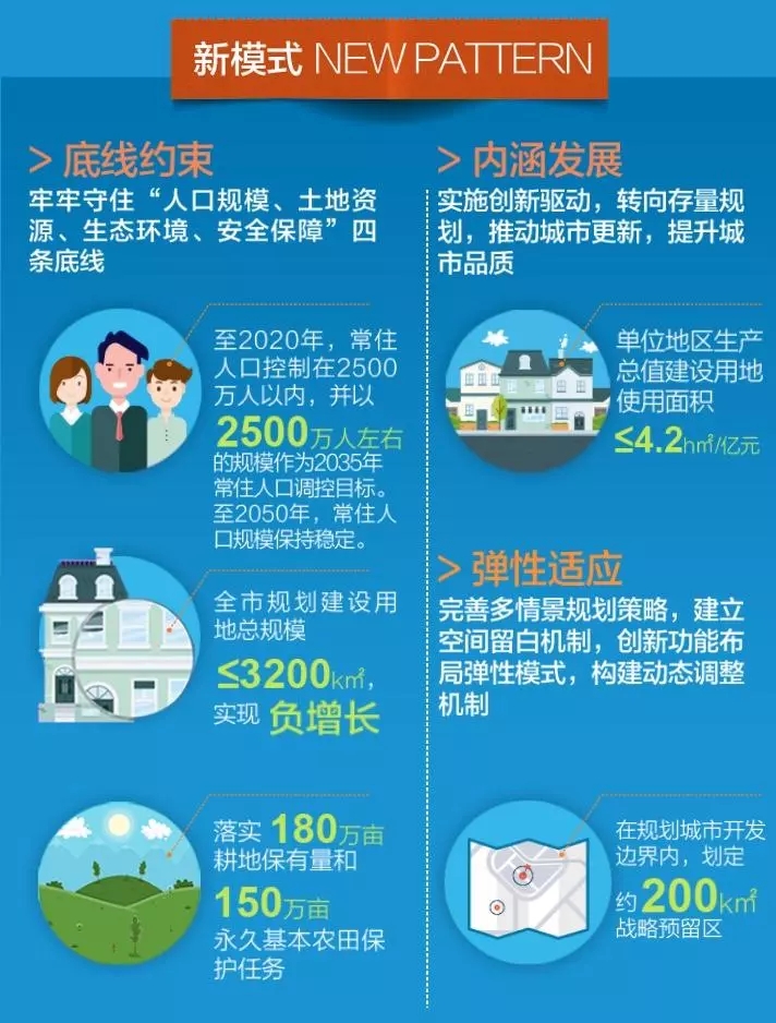人口規(guī)模方面,嚴格控制人口規(guī)模,緩解人口快速增長與資源環(huán)境緊約束之間的矛盾,至2035年常駐人口控制在2500萬人左右,并作為長期調(diào)控目標。在常住人口基礎(chǔ)上,以實際服務(wù)人口需求進行公共資源配置,提高城市對服務(wù)人口的基本保障能力。城市住房養(yǎng)老、基礎(chǔ)教育、體育、綠地等基本公共服務(wù)設(shè)施以滿足常住人口需求為主。水、能源、安全、交通等設(shè)施需要滿足實際服務(wù)人口的需求,規(guī)劃考慮在常住人口基礎(chǔ)上預(yù)留20%以上的彈性。文化、醫(yī)療、教育、體育等高等級公共服務(wù)設(shè)施需要滿足常住人口以及更大區(qū)域內(nèi)人群的需求。