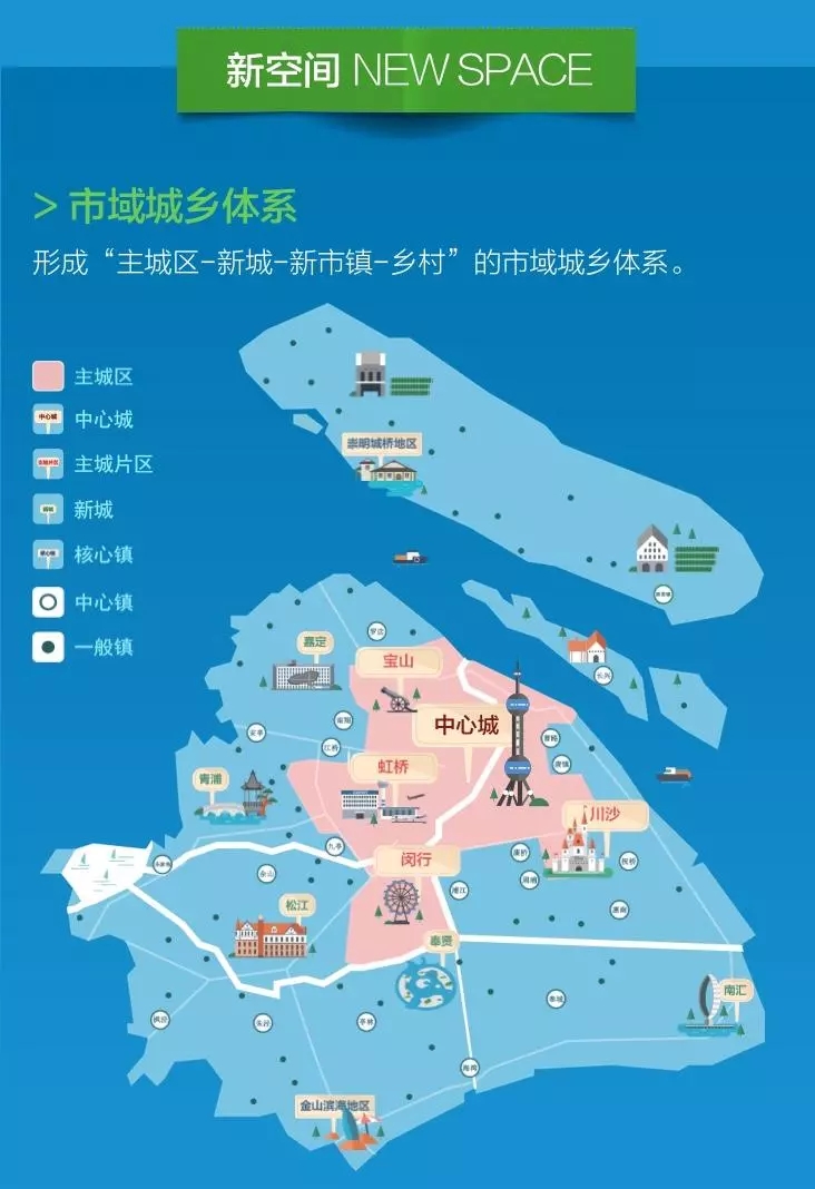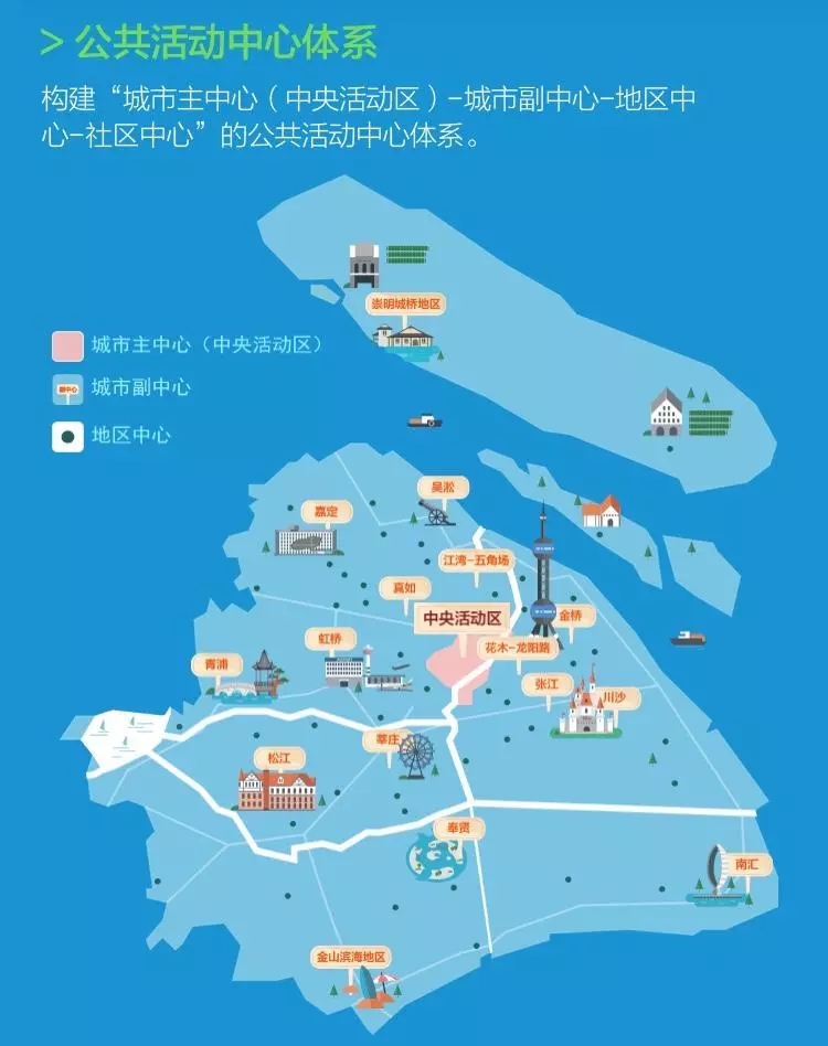中央活動區(qū)包括小陸家嘴、外灘、人民廣場、徐家匯等十幾個區(qū)域,重點發(fā)展金融服務(wù)、總部經(jīng)濟、商務(wù)辦公、文化娛樂、創(chuàng)新創(chuàng)意、旅游觀光等全球城市核心功能。城市副中心包括五角場等9個主城副中心、5個新城中心和金山濱海地區(qū)、崇明城橋地區(qū)2個核心鎮(zhèn)中心等,發(fā)展面向長三角和市域的綜合服務(wù)中心,兼顧全球城市部分核心功能。地區(qū)中心和社區(qū)中心主要承擔所在區(qū)域的公共服務(wù)。