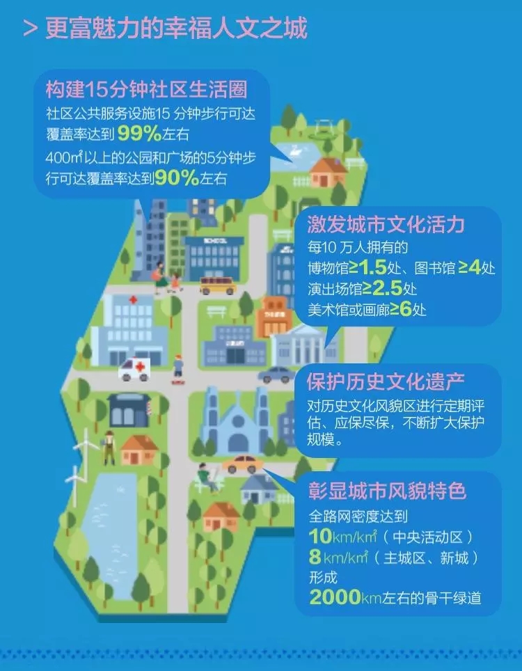 打造15分鐘生活圈,營造幸福宜居社區(qū)。包括:打造宜居、宜業(yè)、宜學、宜游的社區(qū),優(yōu)化社區(qū)生活、就業(yè)和出行環(huán)境,建設(shè)TOD社區(qū),為城市居民提供一個全時段運營的城市。提供覆蓋全年齡段的公共服務(wù)保障,社區(qū)公共服務(wù)設(shè)施15分鐘步行可達覆蓋率將達到99%左右。加快建立多主體供給、多渠道保障、租購并舉的住房制度。多渠道增加租賃性住房比重,至2035年,政府及機構(gòu)持有的租賃性住房比重約8-10%。提供人才公寓、國際化社區(qū)、適老性住宅等滿足市民多層次、多樣化的住房需求。