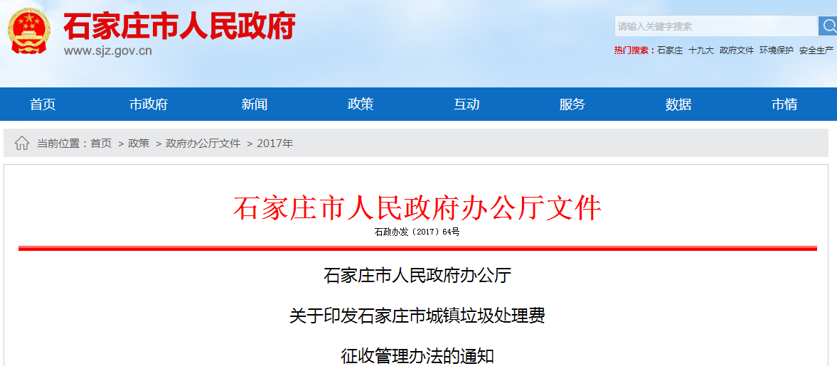 近日,在石家莊市人民政府辦公廳獲悉關于印發(fā)石家莊市城鎮(zhèn)垃圾處理費征收管理辦法的通知,全文如下: