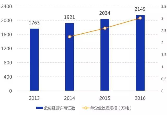 資質(zhì)企業(yè)平均規(guī)模較小:2016年我國(guó)持危險(xiǎn)廢棄物經(jīng)營(yíng)許可證的企業(yè)數(shù)量為2149家,2016年凈增加僅115家,體現(xiàn)出環(huán)保系統(tǒng)對(duì)新頒發(fā)許可證愈發(fā)謹(jǐn)慎;平均每家處理量?jī)H不到3萬(wàn)噸,呈現(xiàn)較強(qiáng)的分散性特征,但單企業(yè)處理規(guī)模由2014年2.2萬(wàn)噸/年增加到2016年3.0萬(wàn)噸/年,未來(lái)隨著許可證頒發(fā)與復(fù)核難度加大,實(shí)力弱、技術(shù)差的小企業(yè)將被淘汰出市場(chǎng),龍頭擴(kuò)張,單企業(yè)規(guī)模繼續(xù)擴(kuò)大。