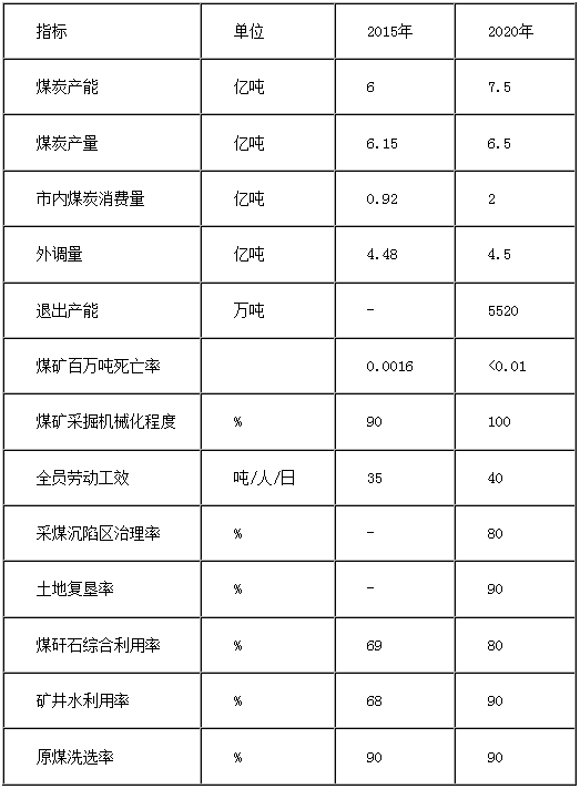 “十三五”期間,在滿足國內(nèi)煤炭市場(chǎng)需求,保障市內(nèi)煤電、煤化工原料煤炭供應(yīng)的前提下,到2020年,全市原煤產(chǎn)能控制在7.5億噸(預(yù)留1億噸市場(chǎng)調(diào)節(jié)產(chǎn)能);產(chǎn)量控制在6.5億噸左右。堅(jiān)持推進(jìn)煤炭綠色開采,采區(qū)回采率達(dá)到85%以上。推廣充填開采、保水開采和薄煤層開采等綠色開采技術(shù)。