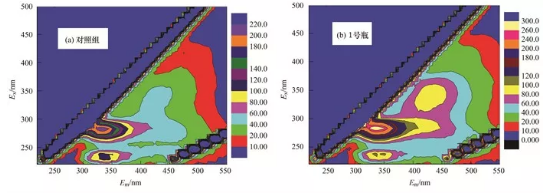 為了更全面地分析DOM,本實(shí)驗(yàn)采用熒光分析儀對(duì)對(duì)照組與1號(hào)瓶堆體第10d的DOM三維熒光光譜特征進(jìn)行了分析,如圖6所示。在不同堆體中均出現(xiàn)了可見(jiàn)光區(qū)類腐殖酸峰A(Ex/Em=310~360nm/400~450nm),紫外光區(qū)類腐殖酸峰B(Ex/Em=250~280nm/420~450nm),類蛋白熒光峰C(Ex/Em=250~280nm/320~380nm)及簡(jiǎn)單芳香蛋白熒光峰D(Ex/Em=220~250nm/300~380nm),添加中藥渣的堆體,其類腐殖酸峰更強(qiáng),表明堆肥腐殖化程度更好,添加外源有機(jī)質(zhì)有利于提高堆肥的腐殖化程度。有研究認(rèn)為BIX在0.6~0.7之間時(shí),DOM主要為陸源輸入,外源輸入特征明顯,而本研究中BIX分別為0.73和0.80,證明了堆肥過(guò)程中DOM主要來(lái)源為自生源。FI是評(píng)價(jià)DOM來(lái)源的依據(jù):FI<1.4來(lái)源于陸地輸入,F(xiàn)I>1.4時(shí)來(lái)自于微生物分解,對(duì)照組和處理組FI為1.57和1.53,表明微生物對(duì)有機(jī)物的降解也是堆肥形成的主要原因。