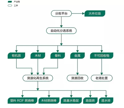 經(jīng)處理后的裝修垃圾主要分為成五大類,分別是:磚瓦等建筑廢棄物,一部分做成路基材料,一部分做成路面磚和透水磚;輕物質(zhì),塑料制品為主,可資源化利用做成塑料顆粒和RDF燃燒棒;木材,經(jīng)過加工處理變成燃燒棒;金屬物質(zhì),直接出售給資源回收企業(yè);有毒有害垃圾,移交有資質(zhì)的危費處理企業(yè)。
