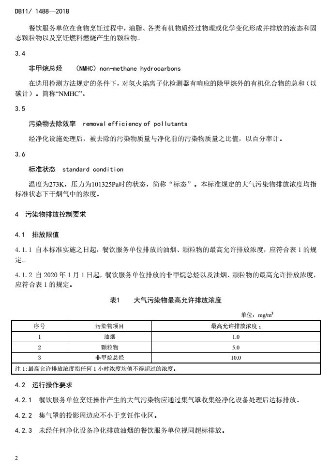 標(biāo)準(zhǔn)規(guī)定了餐飲服務(wù)單位排放的油煙、顆粒物和非甲烷總烴(注:“非甲烷總烴”為表征“揮發(fā)性有機(jī)物”,簡(jiǎn)稱(chēng)“VOCs”的一種指標(biāo))三項(xiàng)污染物的排放限值,明確了三項(xiàng)污染物的監(jiān)測(cè)要求和分析測(cè)定方法,提出了凈化設(shè)備的運(yùn)行操作要求,從而全面控制餐飲業(yè)的大氣污染排放。該標(biāo)準(zhǔn)于2018年1月8日發(fā)布,并將于2019年1月1日起實(shí)施,其中油煙和顆粒物限值自標(biāo)準(zhǔn)實(shí)施之日起執(zhí)行,非甲烷總烴限值自2020年1月1日起執(zhí)行。