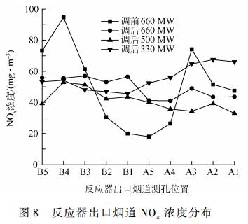 可知,機組調前在660MW負荷下,均值濃度分別為56、43.5mg?m-3,但不同測孔的NOx濃度差異較大,其中B側NOx濃度最大偏差為74.7mg?m-3、而A側為56.2mg?m-3。噴氨格柵優(yōu)化調整后,NOx均值濃度基本不變,而在660、500、330MW負荷下,NOx濃度差異性均明顯降低,B側最大偏差分別降至3.9、13.6、8.6mg?m-3,而A側對應偏差分別為7.9、7.0、15.1mg?m-3。
