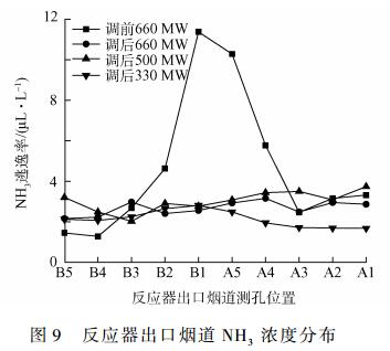 優(yōu)化調后機組660MW負荷下,氨逃逸B側波動范圍為2.16~2.98μL?L-1,A側波動范圍為2.49~3.16μL?L-1,系統平均為2.67μL?L-1。調后機組500MW負荷下,氨逃逸B側波動范圍為2.03~3.21μL?L-1,A側波動范圍為3.08~3.74μL?L-1,系統平均為3.03μL?L-1。