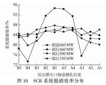 基于全區(qū)域NH3/NOx等摩爾比理念,并綜合考慮該反應器入口的濃度場和速度場狀況進行噴氨格柵優(yōu)化。調整后,在660、500、330MW3種典型工況下,NOx濃度最大偏差分別降至5.8、10.3、11.8mg?m-3,NH3逃逸率由調前的4.64μL?L-1分別降至調后的2.67、3.03、2.14μL?L-1。系統總效率基本不變,但效率峰谷差異下降明顯。