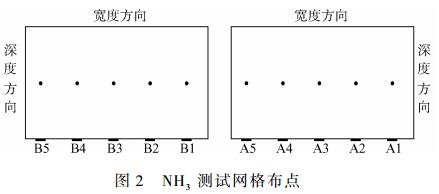通過網格布點測量SCR裝置的入口及出口煙道,煙道共布置10個測孔,編號依次為B5→B1、A5→A1,其中NO、O2取樣點共選取2×5×5個(取深度方向5點均值),NH3取樣點共選取2×5×1個,具體布置如圖1所示。NO、O2經Testo350煙氣分析儀直接測定,氨逃逸樣品采用美國EPA的CTM-027標準以化學溶液法采集,取樣時間20min。通過分析樣品溶液中的氨濃度(見圖2),并根據所采集的干態(tài)煙氣流量和O2,計算各點干基煙氣NH3濃度。