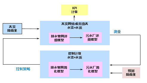 采用預(yù)測降雨量(約半小時之內(nèi)),結(jié)合水流、水質(zhì)簡化模型,管網(wǎng)優(yōu)化目標以及物理約束等計算出一段采樣時間內(nèi)的最優(yōu)控制策略(主要針對水閥水泵)并賦給管網(wǎng)仿真系統(tǒng)或真實管網(wǎng)系統(tǒng),優(yōu)化控制軟件采用自主研發(fā)平臺MPCTool;