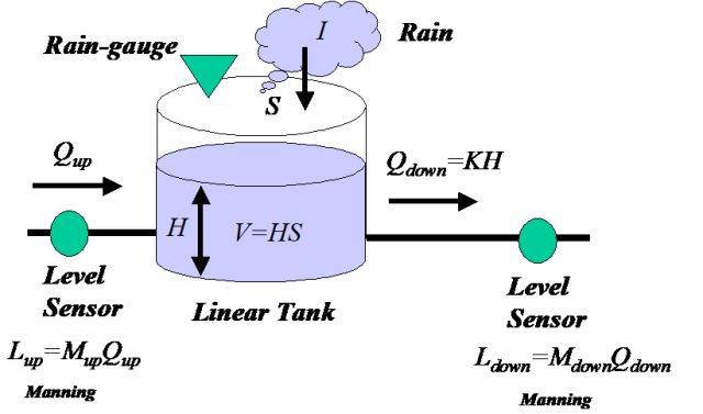 如圖3所示,Linear Tank代表集水區(qū),I 為降雨強度,S為集水區(qū)表面積,Lup,Ldown為上下游水位值,通過水位水流轉(zhuǎn)換系數(shù),可計算的上游、下游水流量Qup,Qdown,其中Lup,Ldown以及I降雨強度分別由水位傳感器和雨量計測量提供,是模型校驗的訓練數(shù)據(jù)集 [2]。