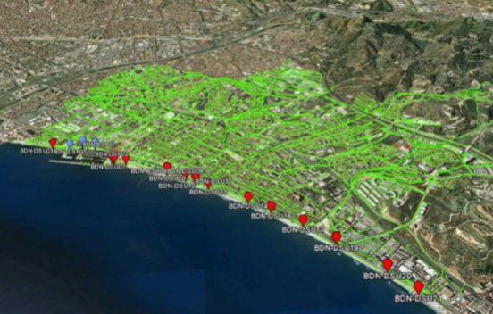 圖9. 巴達洛納排水管(綠色)、水廠(藍色)、溢流(紅色)網(wǎng)示意圖