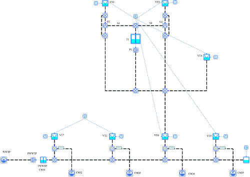 經(jīng)MPCTool平臺的模型管理模塊,將巴達洛納排水系統(tǒng)簡化(圖10),其中VT為集水區(qū)模型,在每個集水區(qū)內(nèi)部又包含相關(guān)區(qū)域內(nèi)的具體管網(wǎng)圖;T1為沉淀池;G為閥門;P1為水泵;WWTP為相應(yīng)污水處理廠;CSO為污水溢流。其中兩個不同的集水區(qū)VT1,VT3通過閥門G1,G2將雨污水輸送至沉淀池,之后水泵P1將雨污水抽至污水處理廠經(jīng)處理后釋放至地中海中。當污水處理廠超出容量后,污水溢流產(chǎn)生。巴達洛納排水系統(tǒng)集成控制目標為: