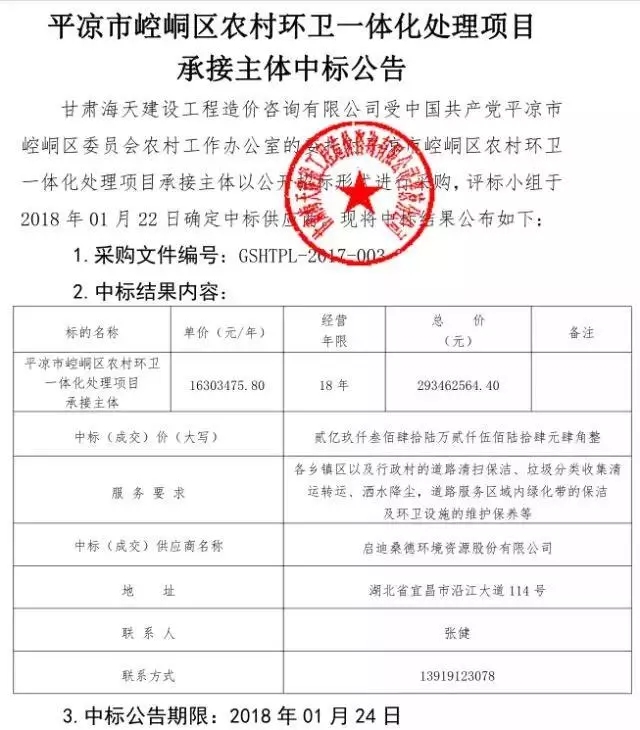1月24日,據(jù)甘肅省政府采購網(wǎng)消息,桑德環(huán)衛(wèi)中標(biāo)平?jīng)鍪嗅轻紖^(qū)農(nóng)村環(huán)衛(wèi)一體化處理項目包括各鄉(xiāng)鎮(zhèn)區(qū)以及行政村的道路清掃保潔、垃圾分類收集清運(yùn)轉(zhuǎn)運(yùn)、灑水降塵,道路服務(wù)區(qū)域內(nèi)綠化帶的保潔及環(huán)衛(wèi)設(shè)施的維護(hù)保養(yǎng)等,服務(wù)年限18年,中標(biāo)總額293462564.40元。