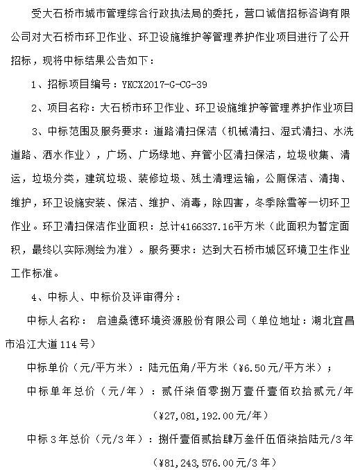 0.81億元中標(biāo)大石橋市環(huán)衛(wèi)作業(yè)、環(huán)衛(wèi)設(shè)施維護(hù)等管理養(yǎng)護(hù)作業(yè)項目