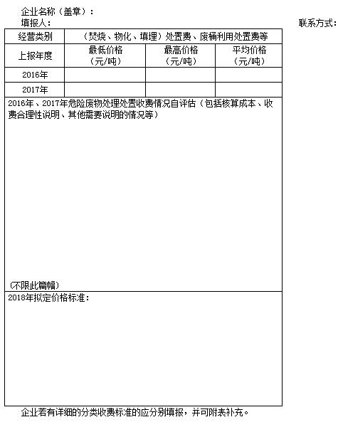 各經(jīng)營(yíng)單位須按照附表1格式要求,如實(shí)填報(bào)2016、2017年危險(xiǎn)廢物處理處置收費(fèi)情況,并通過(guò)核算企業(yè)處置成本,評(píng)估分析2016年、2017年經(jīng)營(yíng)價(jià)格,預(yù)報(bào)2018年經(jīng)營(yíng)價(jià)格。于2018年2月7日之前報(bào)送上海市環(huán)保局,并抄送上海市固體廢物管理中心。