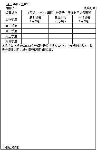 1.各危險(xiǎn)廢物經(jīng)營(yíng)單位從2018年1月起,結(jié)合每季度經(jīng)營(yíng)情況季報(bào),根據(jù)企業(yè)實(shí)際運(yùn)營(yíng)情況,按照附表2格式向市固廢管理中心如實(shí)報(bào)送每季度處理處置收費(fèi)情況表;并于每年度1月31日前,上報(bào)上個(gè)年度危險(xiǎn)廢物處理處置收費(fèi)情況,參照附表1格式。