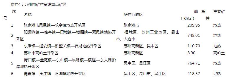 以地?zé)?、高嶺土等蘇州優(yōu)勢特色礦產(chǎn)為主,在張家港市、昆山市、吳中區(qū)、吳江區(qū)、高新區(qū)等資源較為豐富和集中的區(qū)域劃定6個重點礦區(qū)。