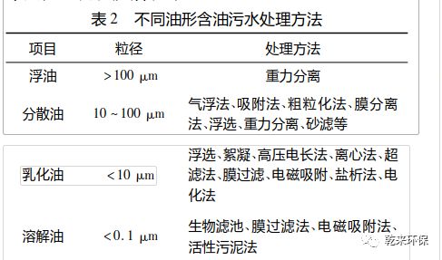 在油田采油污水中,根據(jù)原油粒徑的不同分為四種油形。中國大多數(shù)油田常采用一級處理也就是 預(yù)處理去除浮油,二級處理來破乳和去除分散油,深 度處理主要是除掉溶解油。富含不同油形含油污水 常用處理方法具體見表 2。