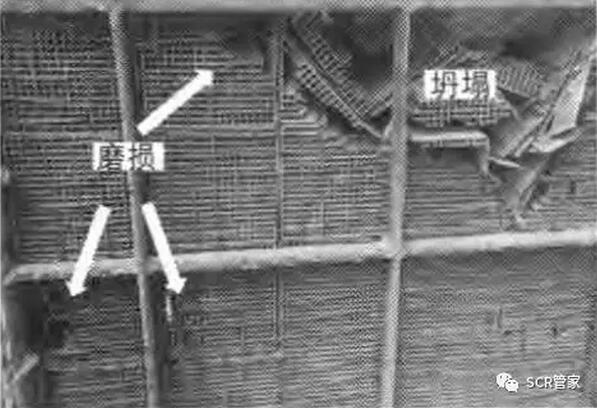 高溫?zé)煔鈹y帶大量顆粒物進(jìn)入SCR反應(yīng)器與催化劑發(fā)生碰撞,在“馬格努斯效應(yīng)”下將使催化劑壁厚逐漸減小而造成磨損,甚至導(dǎo)致催化劑的坍塌,如圖1所示。催化劑磨損與流場分、煙氣特性、飛灰特性等因素有關(guān)。